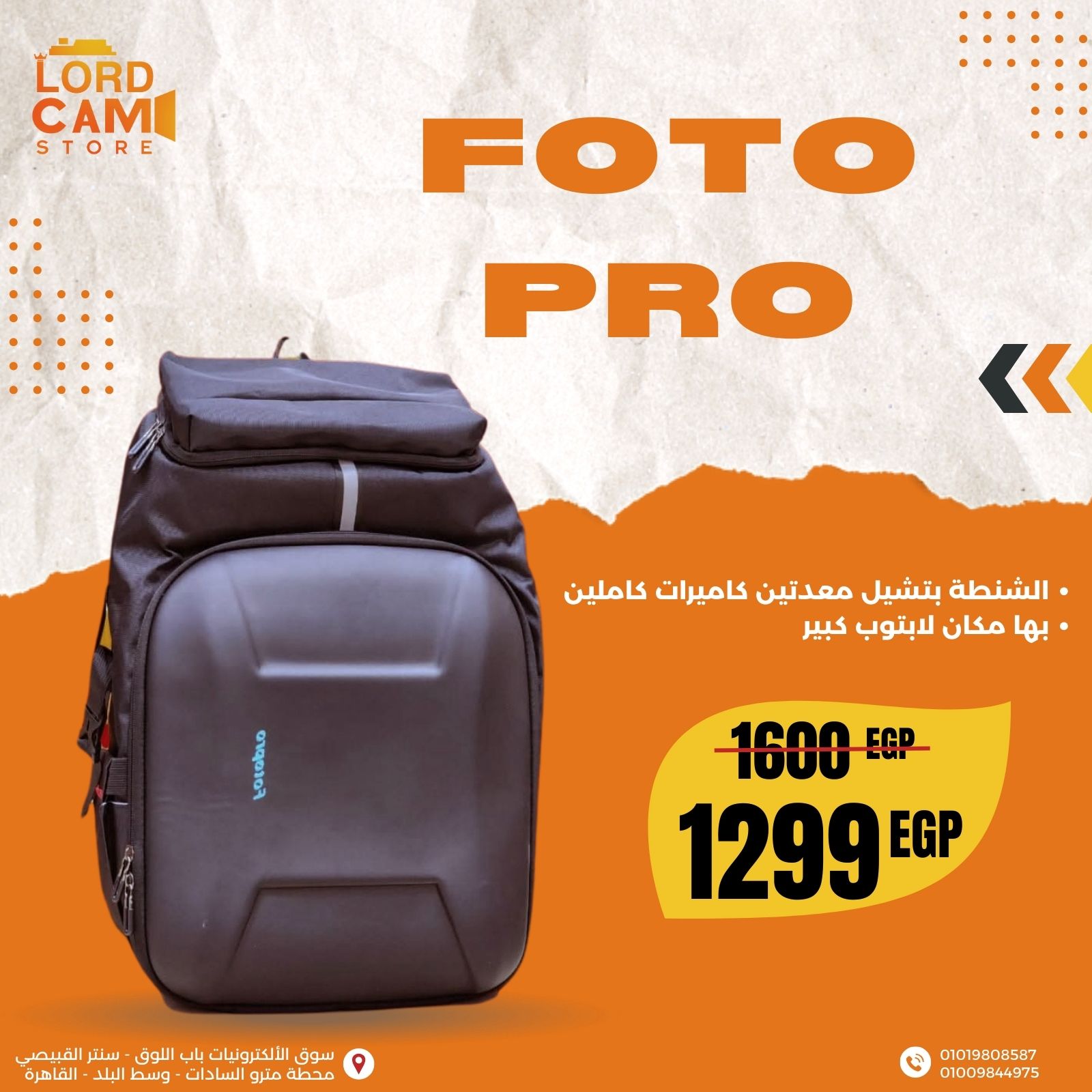 شنطة Foto Pro الاحترافية – سعة لكاميرتين ولابتوب كبير مع حماية متكاملة السعر الأصلي هو: 1199 EGP.السعر الحالي هو: 949 EGP.
