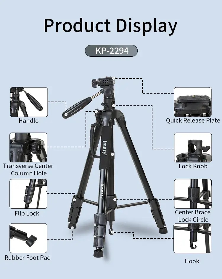 احصل على الاستقرار والمرونة مع ترايبود Jmary KP-2294، المصنوع من الألمنيوم المتين والخفيف الوزن، مع تصميم قابل للطي يسمح بحمله بسهولة، مع ارتفاع قابل للتعديل من 60 سم حتى 179 سم.
